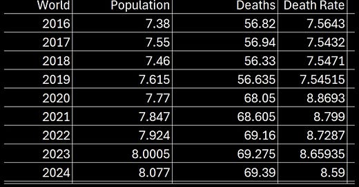 Which implies that an extra 13 million people (89 million in 2024 – 56-57 million in 2019) extra deaths from something else.
